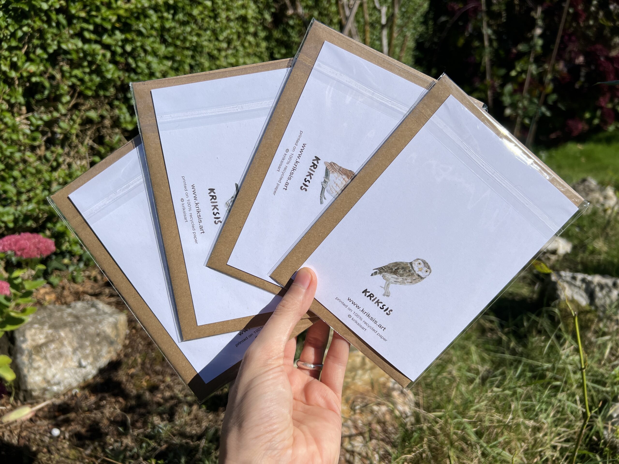 Cards are created using my watercolour illustrations made in 2025. Printed onto high quality FSC certified, 100% Recycled, Carbon Offset, Fully Recyclable cards with the inside left blank. They are paired with recycled envelopes from eco-craft in natural brown or grey colour and covered with cello bags. (which you can reuse afterwards)