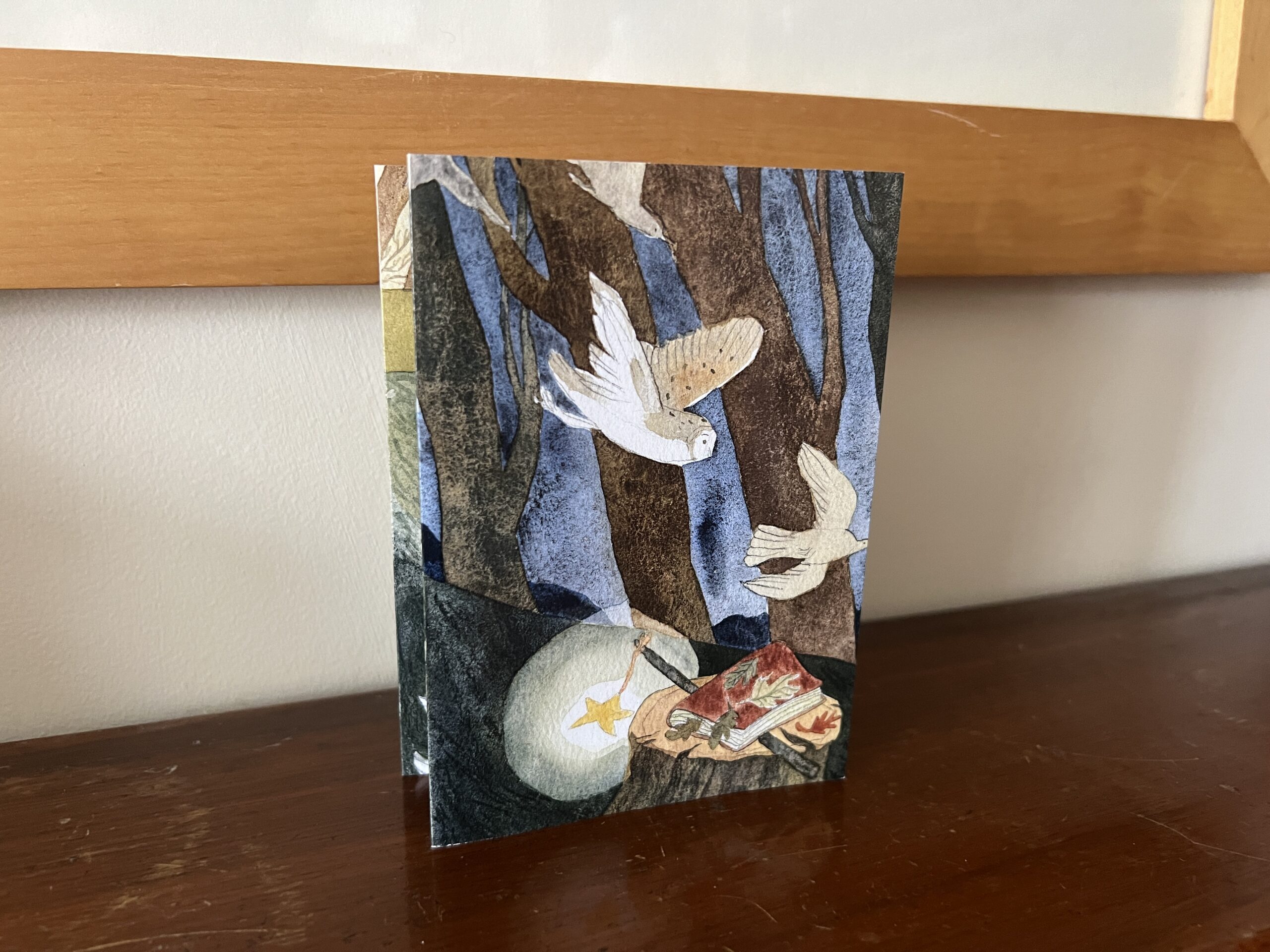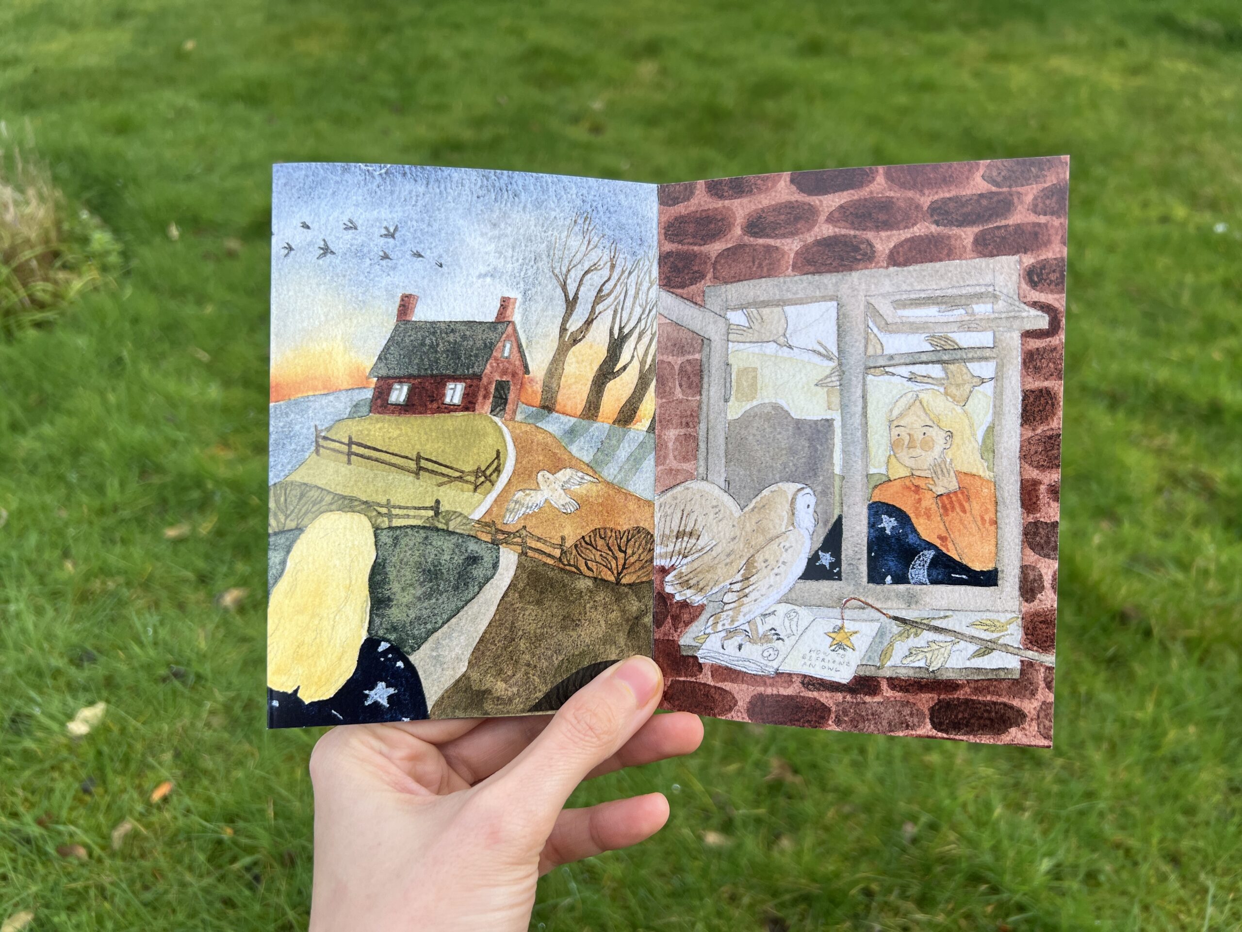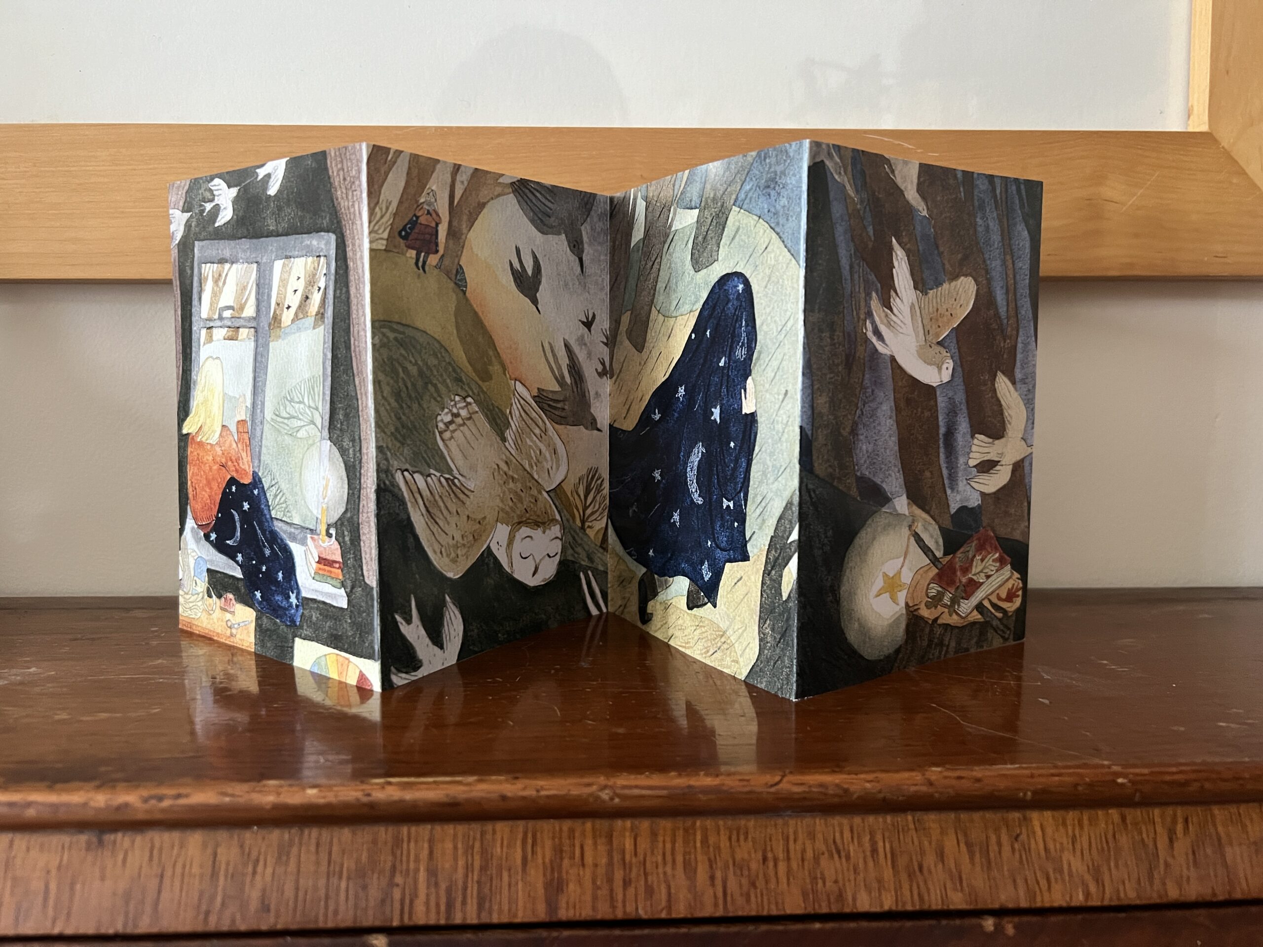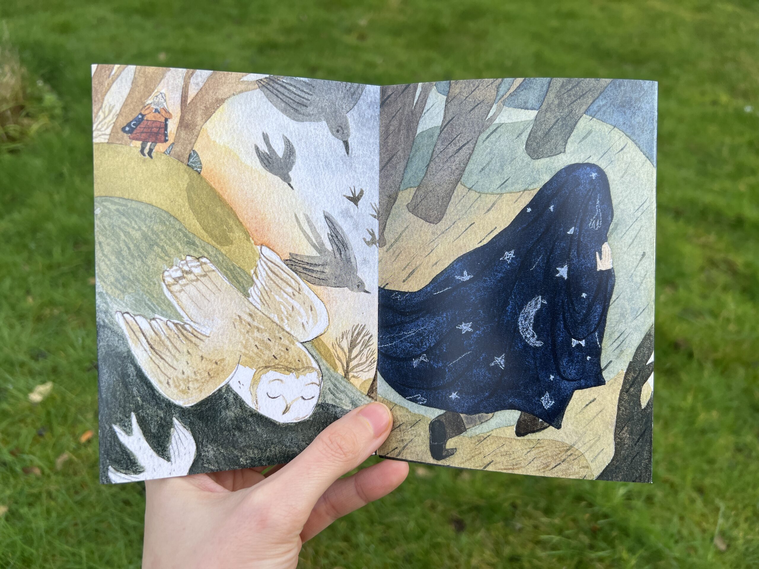 During January I worked on 8 page story featuring prompts from 2025 Folktale week – Night, Echo, Rain, Book, Charm, Storm, Dawn and created my own story about unexpected journey that the girl goes through following the Owl only to end up where she started.